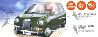 これまで自動車、車両等の表面加工の大部分は有機系溶剤の塗り込み施工であり、撥水性の塗膜がもてはやされてきましたが、21世紀に入り、親水性塗膜の有用性が重要視されています。クオーツガラスコーティングは親水タイプなので、ガラス塗膜の汚れは水がかかると自己洗浄機能を発揮。コーティング後は酸性雨などにより塗装面を痛めることもなく、輝きを長時間にわたり持続させ、ユーザーのメンテナンス労力を大幅に軽減します。また、全て吹き付け施工であり、その効果は従来品と比較にならないばかりか、常識外の耐久性といえます。